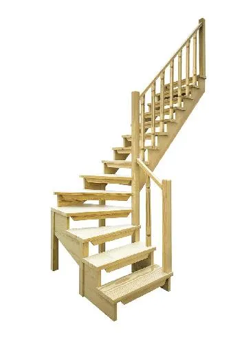 Удобная лестница на косоурах с поворотом на 90 градусов. Открытые ступени визуально облегчают конструкцию. Ограждения по всему маршу обеспечивают дополнительную безопасность и возможность декорирования. Монтаж осуществляется силами двух человек на объекте по указаниям, приведенным в паспорте на лестницу.