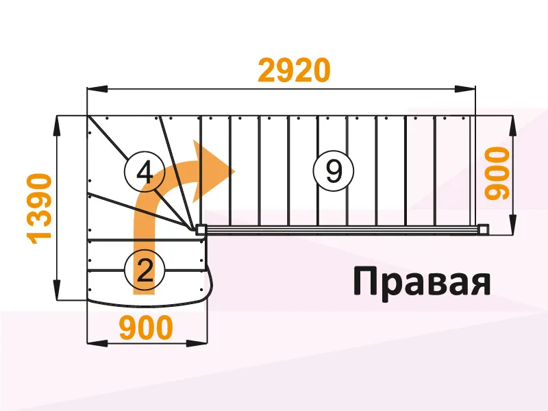 Поворот лестницы на 90 градусов выполнен с помощью 4-х забежных ступеней. Первая ступень лестницы - пригласительная (скруглены внешние углы)