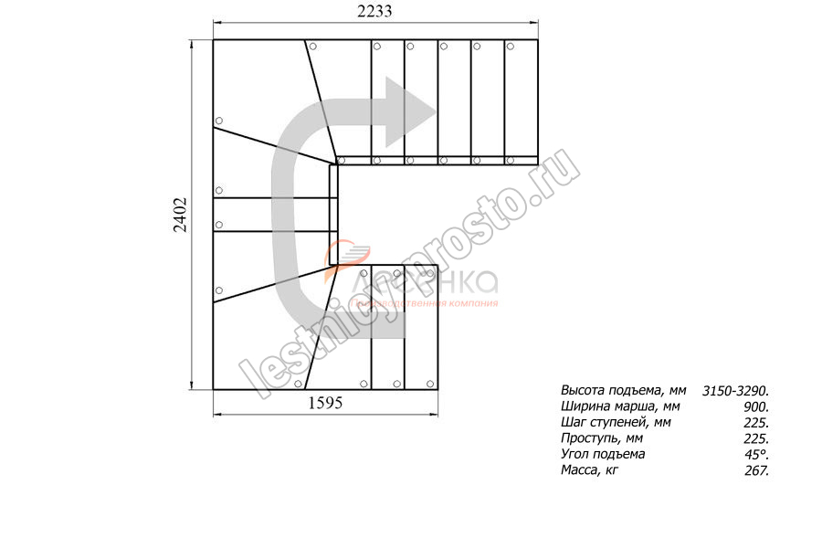 Модульная лестница Спринт 225 3150-3290, Серый, Сосна, Нержавеющая сталь