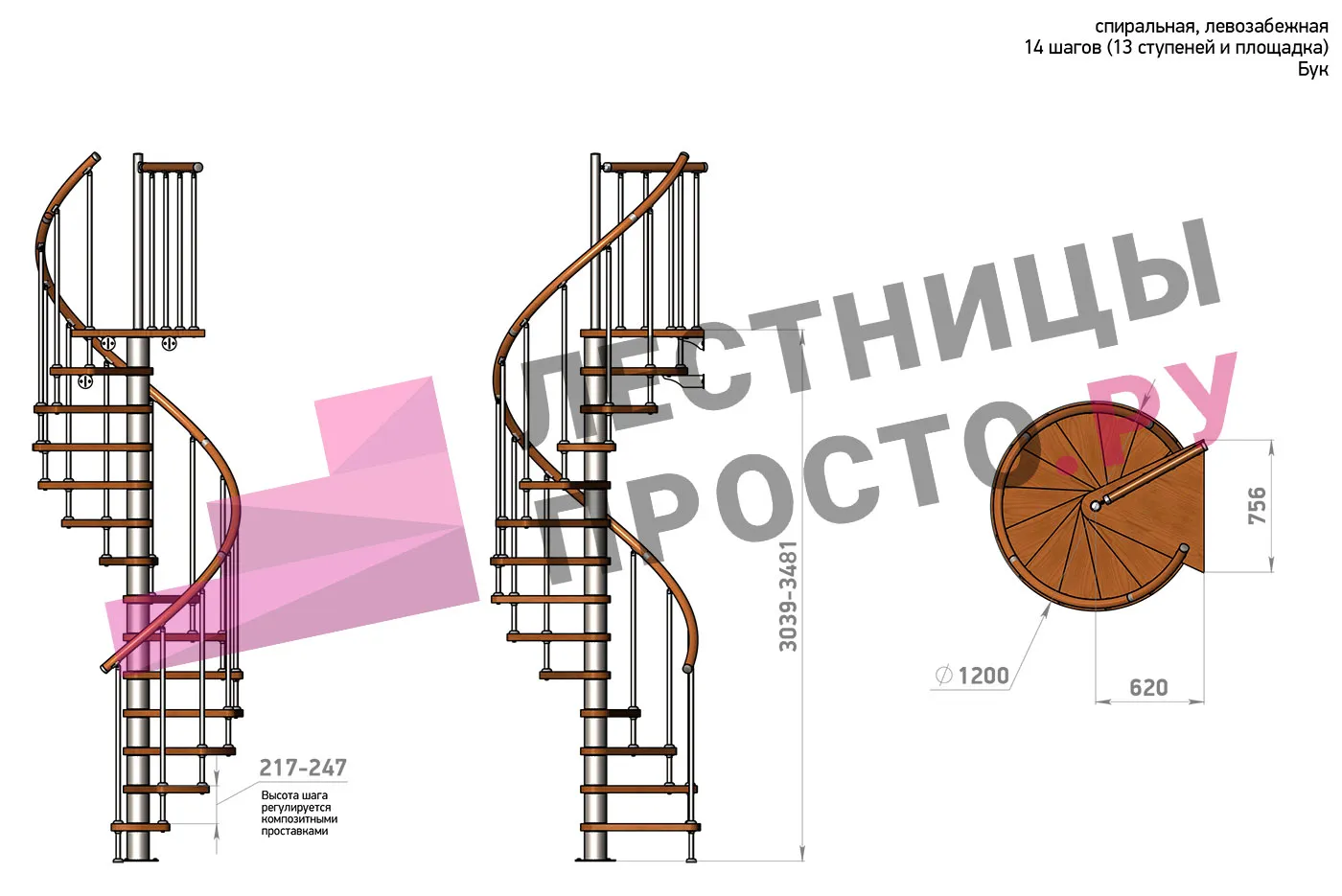 Винтовая лестница Prosto Spiral White D140см, h260.5-304.6 см, бук |
